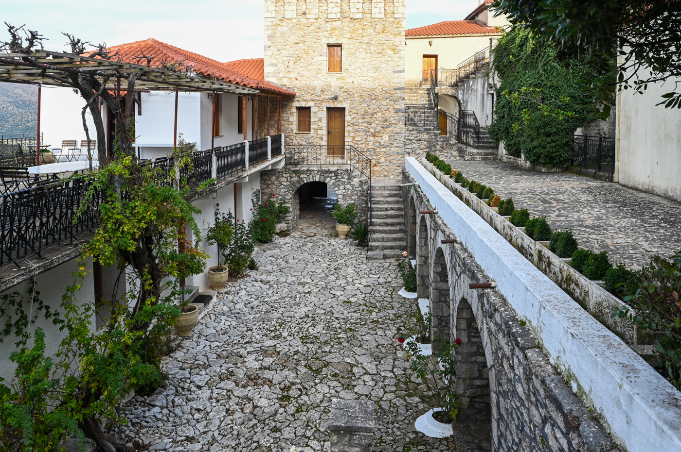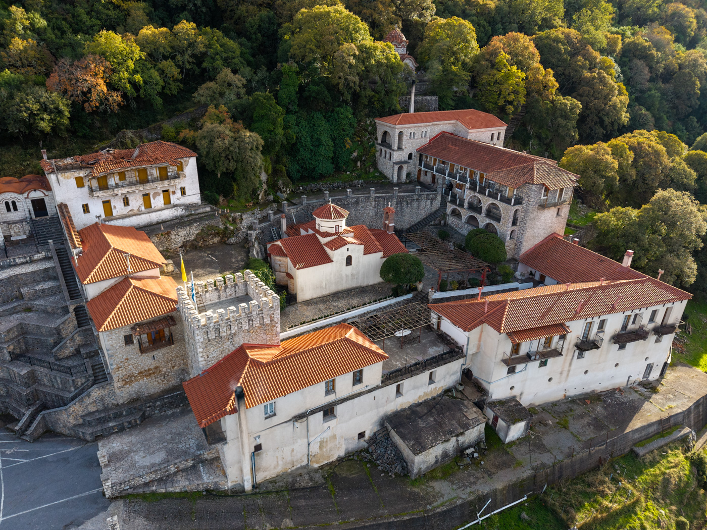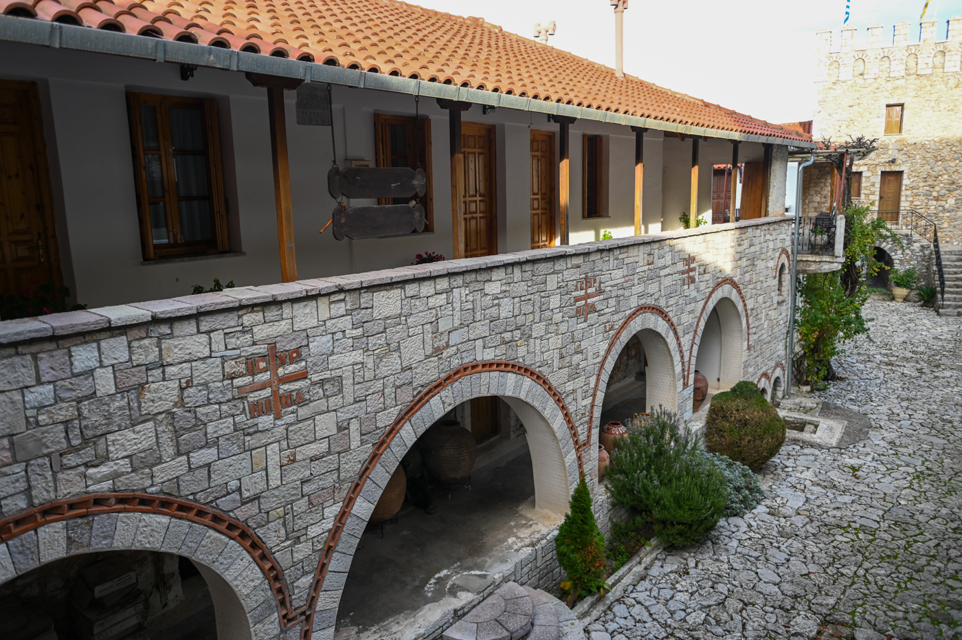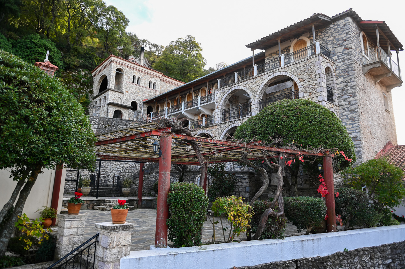 Οι αυλές χωρίζονται σε τρία επίπεδα – βαθμίδες. Στο βόρειο μέρος (δεξιά του εισερχόμενου) υπάρχει τριώροφη πτέρυγα, στην οποία βρίσκονται η Τράπεζα, το Αρχονταρίκι και το Δεσποτικό. Επίσης, τριώροφη πτέρυγα υψώνεται και στα δυτικά, όπου βρίσκεται το Ηγουμενείο και οι κοιτώνες των μοναχών. Γύρω τα διάφορα κτίρια σχηματίζουν ένα παραλληλόγραμμο. Στο μεσαίο επίπεδο οικοδομήθηκε το Καθολικό, ο Ναός του Αγίου Νικολάου, παράλληλα προς τον αναλημματικό τοίχο. Παχύ ασβεστοκονίαμα έχει καλύψει την τοιχοποιία του Ναού.