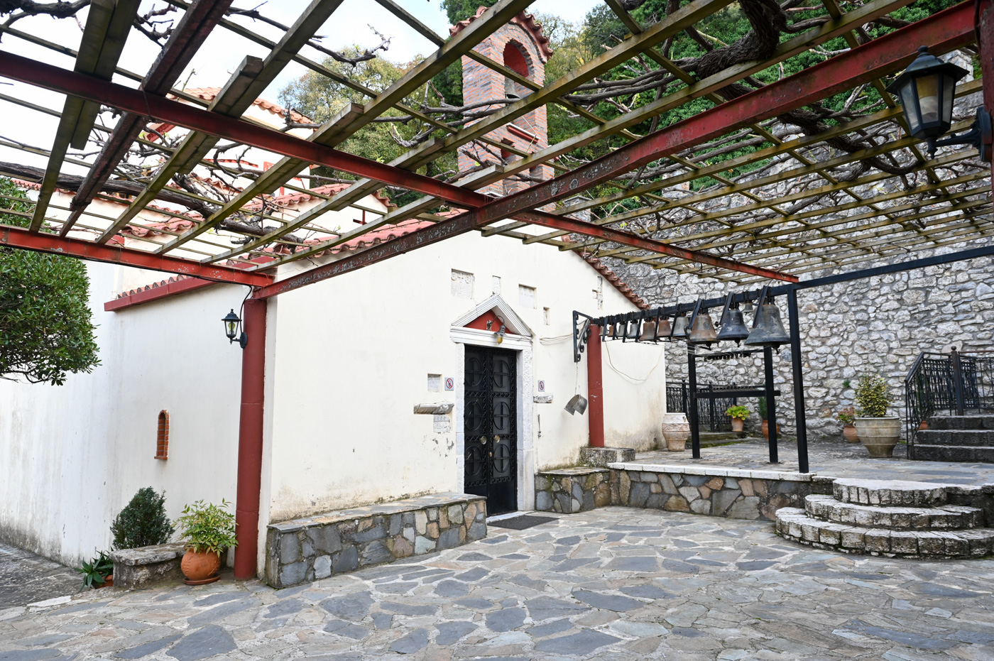 Η πόρτα της Μονής, η κύρια είσοδος, βρίσκεται στην ανατολική πλευρά και οδηγεί μέσα από το καμαροσκέπαστο «διαβατικό», στο προαύλιο του Αγίου Νικολάου. Ο φρουριακός χαρακτήρας της Μονής είναι έκδηλος, καθώς η Μονή οργανώνεται σε διάφορα επίπεδα λόγω της μορφολογικής διαμόρφωσης του εδάφους.