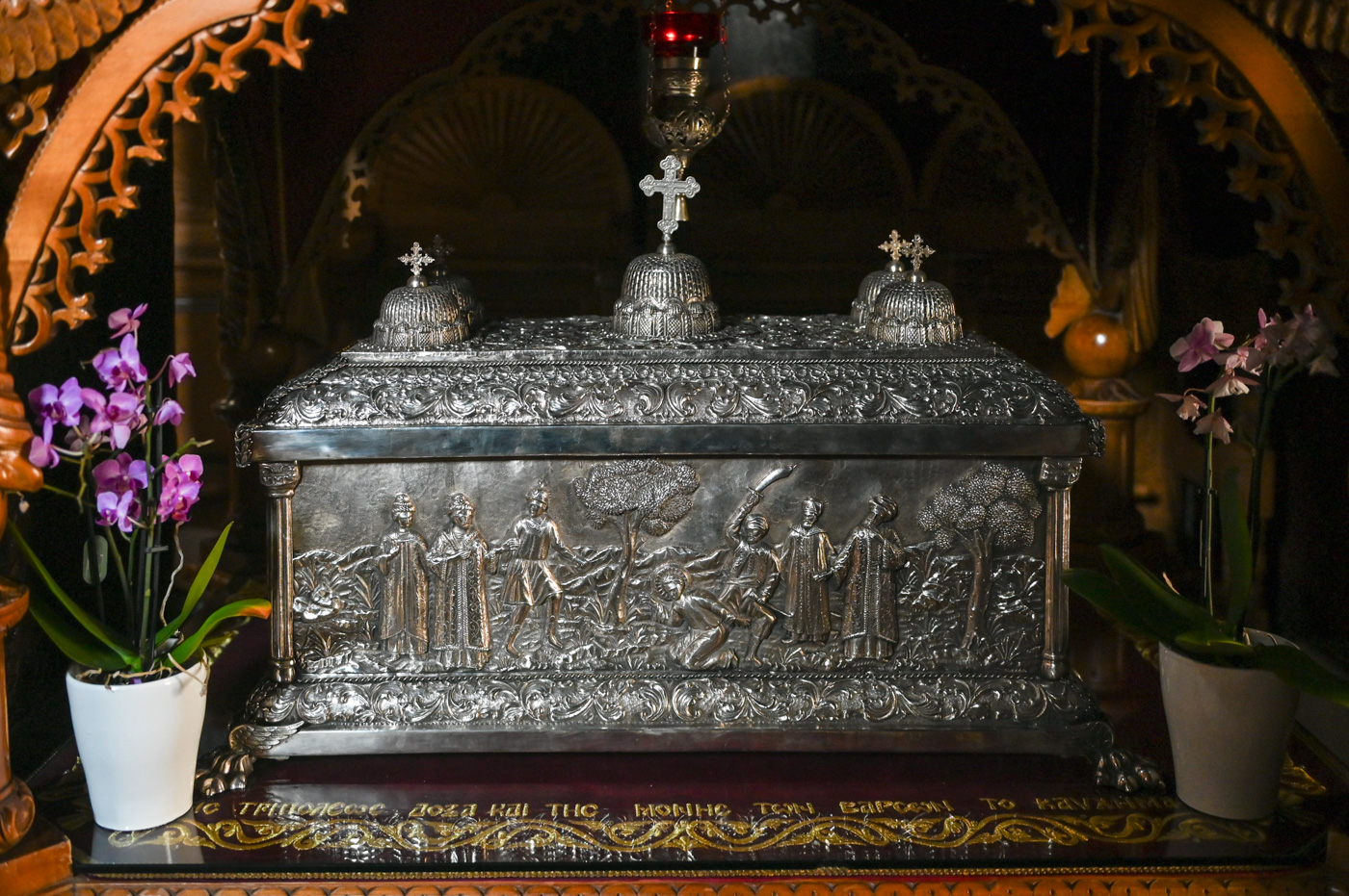 ε) Λείψανα των «εν τη Ιερά Λαύρα του Αγίου Σάββα αναιρεθέντων πατέρων», φυλασσόμενα σε ξύλινη λειψανοθήκη.