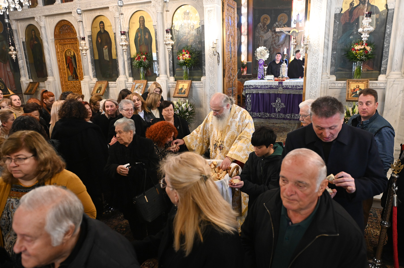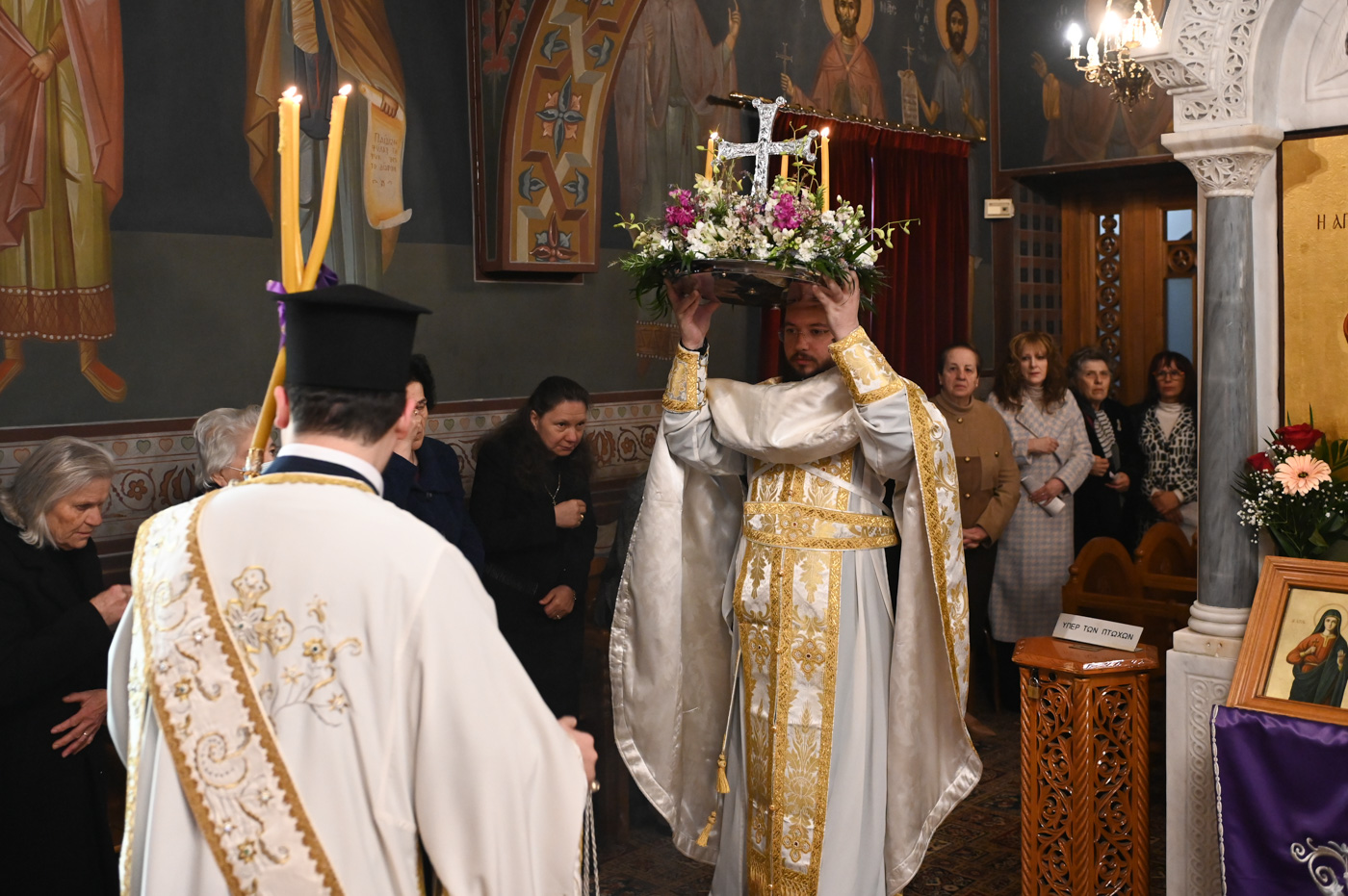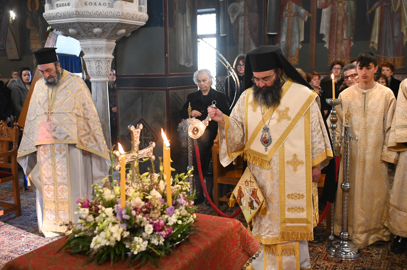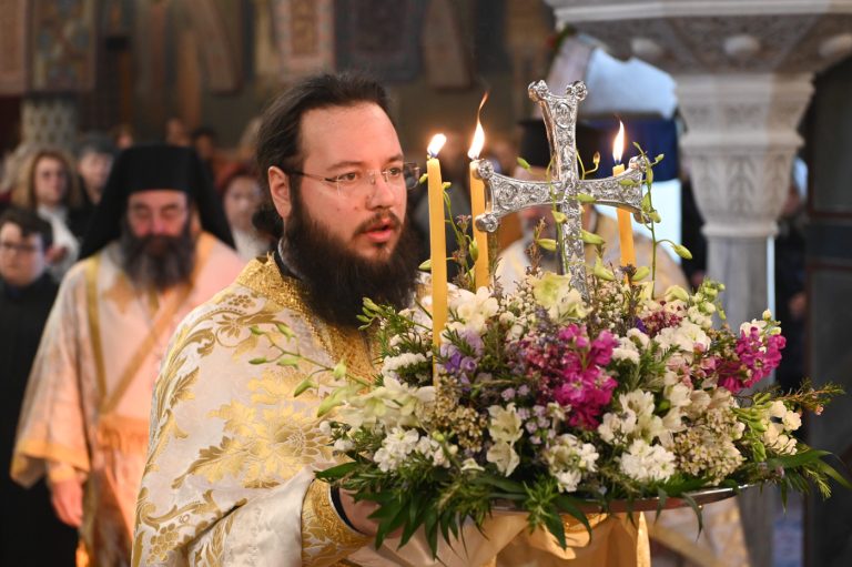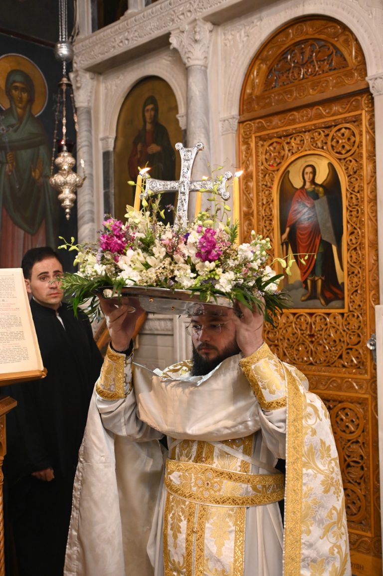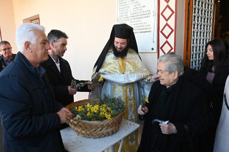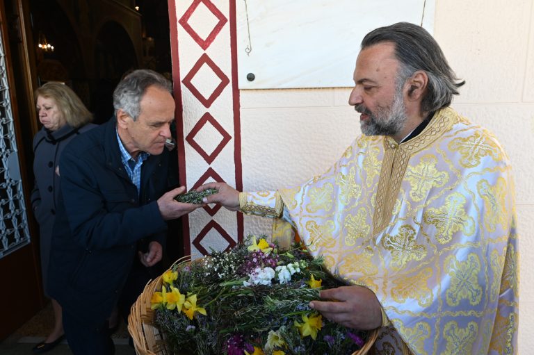 Πλήθος πιστών έφτασε στον Ιερό Ναό για να συμμετάσχει στην Θεία Λειτουργία, να προσκυνήσει τον Τίμιο Σταυρό και να λάβει από τον Ιερέα, εν είδει ευλογίας, τα καθιερωμένα άνθη.