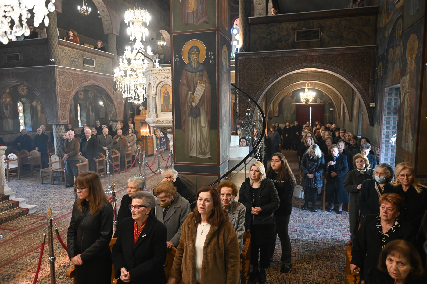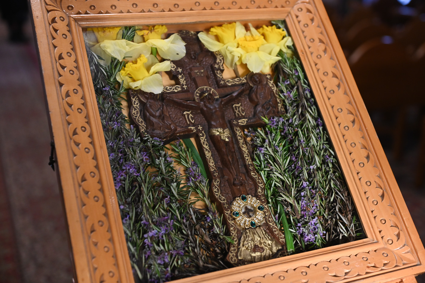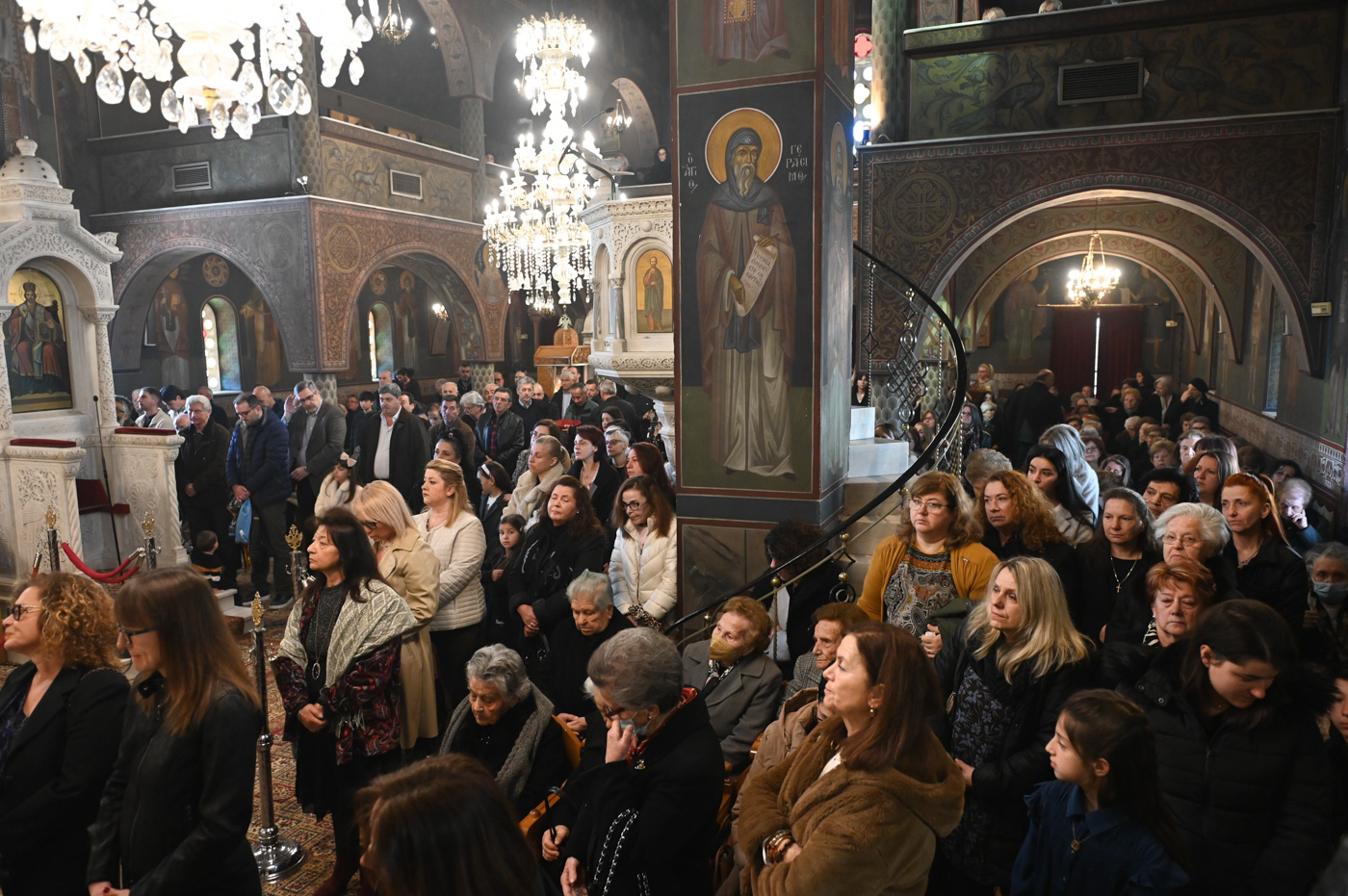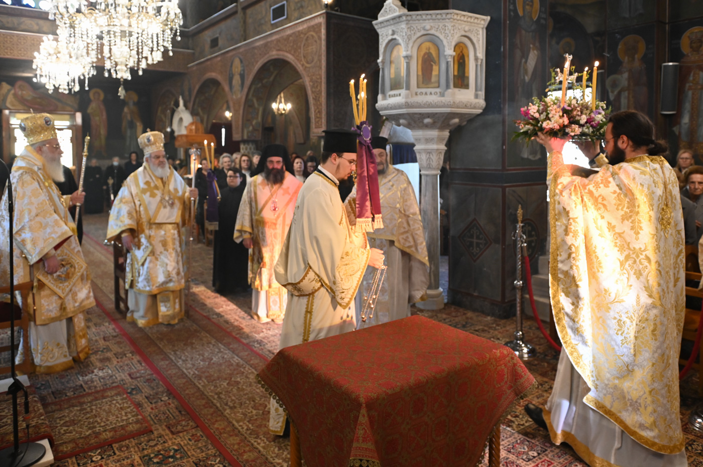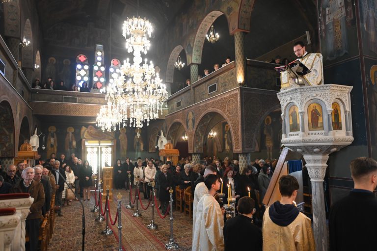 Πλήθος πιστών έφτασε στον Ιερό Ναό για να συμμετάσχει στην Θεία Λειτουργία, να προσκυνήσει τον Τίμιο Σταυρό και να λάβει από τον Ιερέα, εν είδει ευλογίας, τα καθιερωμένα άνθη.